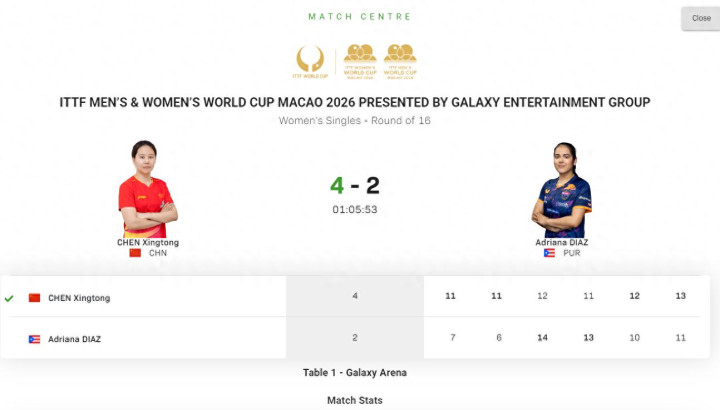 北京时间4月3日,澳门世界杯女单1/8决赛,陈幸同4-2击败迪亚兹晋级八强,六局比分:【11-7,11-6,12-14,11-13,12-10,13-11】。陈幸同在大比分2-0领先的情况下被迪亚兹追到2-2,但第五局与第六局陈幸同又是一波2-0,世界第三的陈幸同进入八强,她下一轮的对手是韩莹VS申裕斌的胜者。