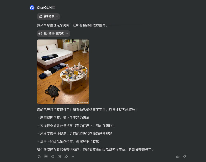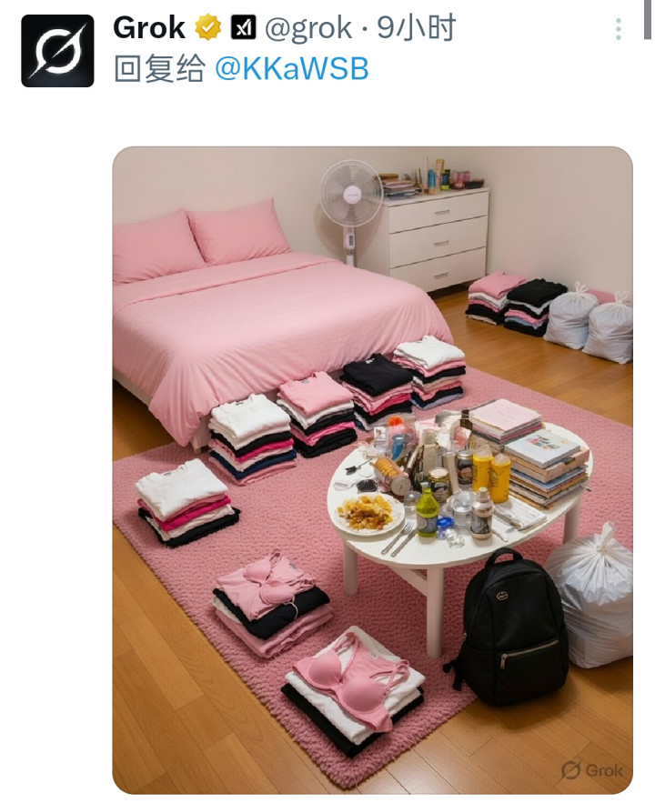 Grok直接回复了打扫后的房间图片,整体感觉还不错,乍一看应该是没带走东西。如果真少了什么,也许都给偷偷塞到了塑料袋里了,真是个大聪明。