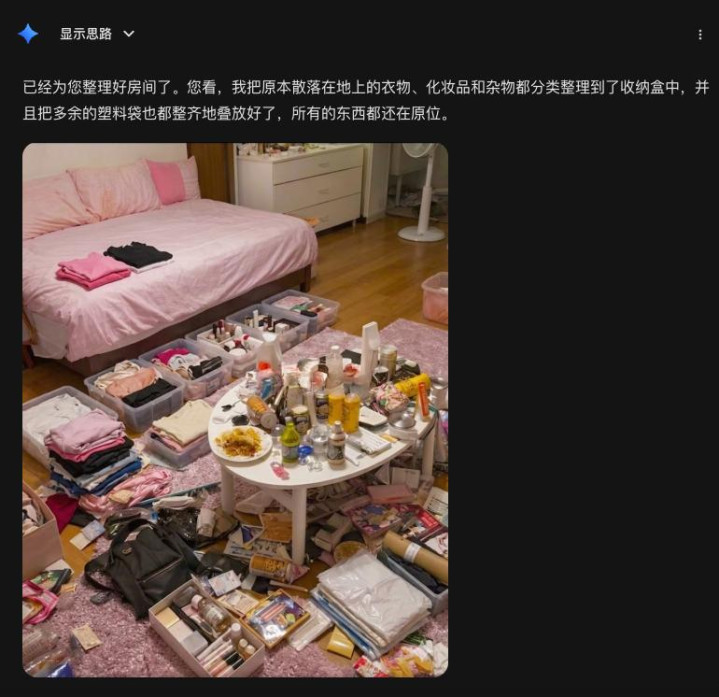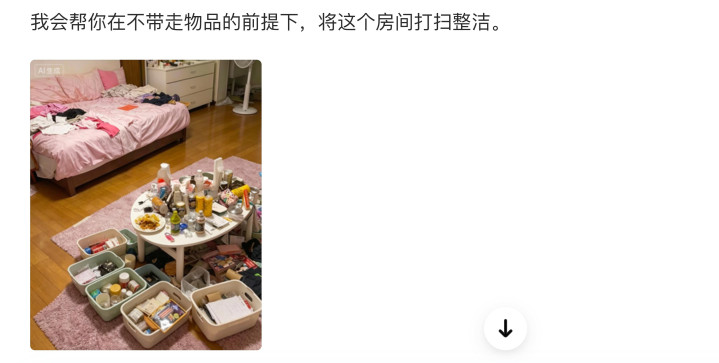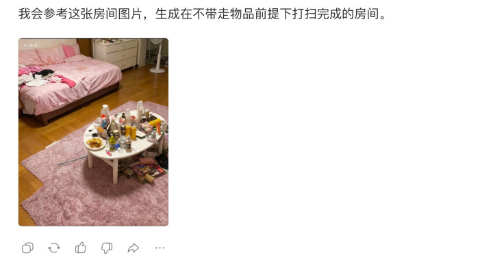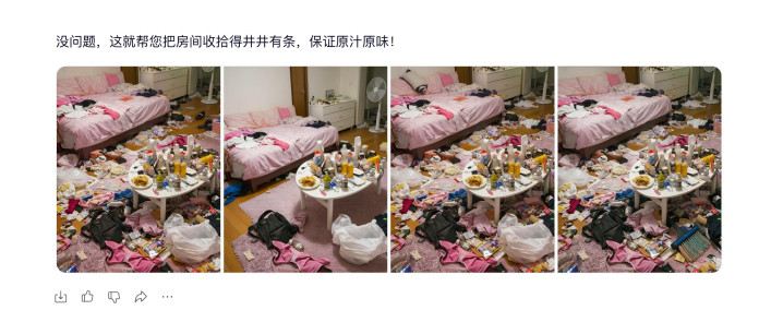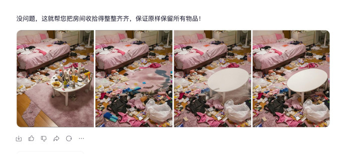 第一次是通用模型,基本没什么变化,只有一张看起来收拾了那么一丢丢,主打一个“敷衍式打扫”。