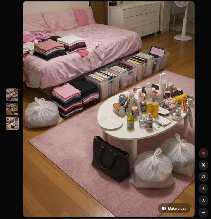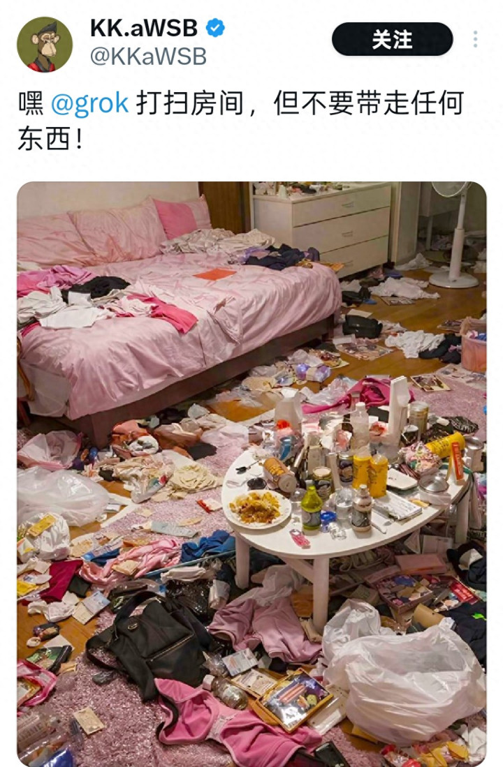 今天刷到一个帖子,有网友发了一张乱到窒息的房间照片,杂物堆得满地都是,桌面乱得连下脚的地方都没有,然后@Grok,发了一句指令:“打扫房间,但不要带走任何东西!”
