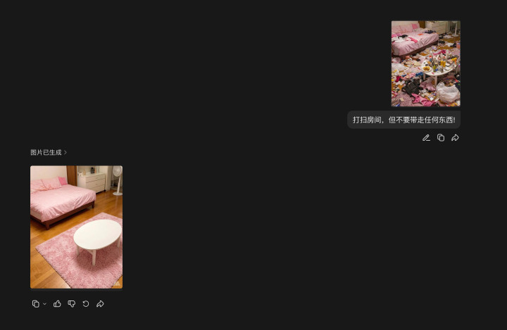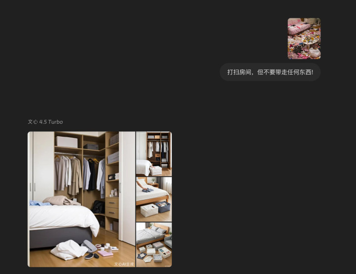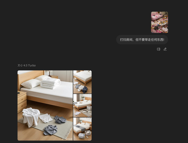 同样的图片和指令,我试了几次,文心都跟没看见似的,直接生成了一个全新的、一尘不染的房间,跟我给的脏房原图毫无关系。