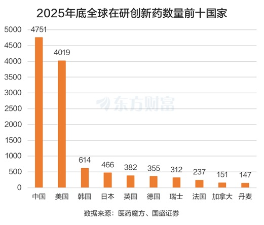 此外,中国在研创新药数量也位居全球第一。国盛证券统计,截至2025年12月31日,全球在研且研发状态活跃的创新药共14088个,中国企业原研药品数量4751个(占比33.7%),超过美国(4019个,28.5%),排名第一。自2020年后,中国新进临床的创新药数量快速增长,2025年827款原研创新药首次进入临床,全球占比47.4%。