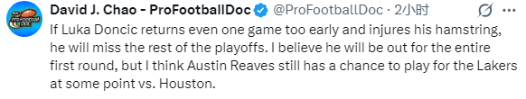 对于东契奇和里夫斯季后赛复出的可能性,知名体育伤病专家David J. Chao表示:如果东契奇提早复出哪怕一场比赛,导致他的腿筋再次受伤,他将错过整个季后赛,我相信他会错过整个首轮,但里夫斯有机会在对阵火箭的系列赛某个时刻复出。